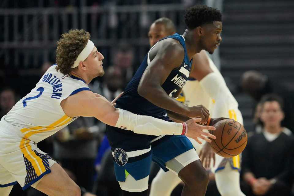 勇士过去3场连输雷霆、爵士与公牛遭遇3连败,森林狼过去3场连输魔术、湖人与快船遭遇3连败,本赛季前三次交锋勇士1胜2负处于下风。本场勇士缺少库里、穆迪、巴特勒、追梦,首节开局双方5-5,双方交替领先缠斗至森林狼11-12落后,森林狼连得4分取得领先。勇士一波7-0攻势反超,里德与波杰姆斯基对攻一记三分,森林狼连得5分反超。双方继续紧咬比分缠斗,森林狼首节末段取得微弱优势,首节结束森林狼31-28领先勇士。首节森林狼23中8,其中三分10中4,爱德华兹4中1得到9+3+2;勇士23中9,其中三分11中4,波尔津吉斯7分与波杰姆斯基8分。