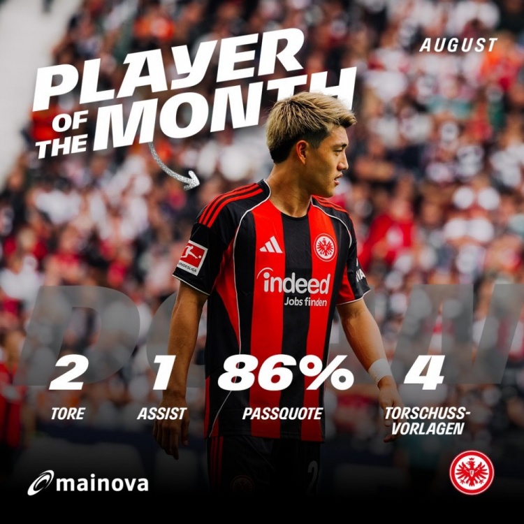 9月11日讯 法兰克福昨日官方宣布,效力于该队的日本国脚堂安律当选球队8月最佳球员。